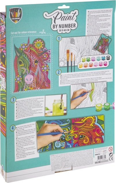 Discover the magic of paint by numbers and create your own artwork with a unicorn motif. The 30 × 40 cm canvas set includes everything you need: a pre-printed canvas, acrylic paints, and 3 brushes. Painting is easy, relaxing, and develops fine motor skills and concentration.