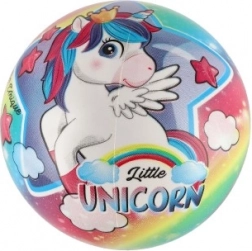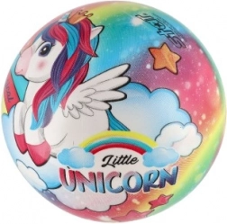 The ball is adorned with a unicorn motif with a rainbow, stars, and clouds, making it visually appealing for children.