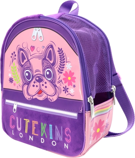 The CUTEKINS kids' backpack features a zipped front pocket, a mesh side pocket for a bottle, and comfortable shoulder straps.