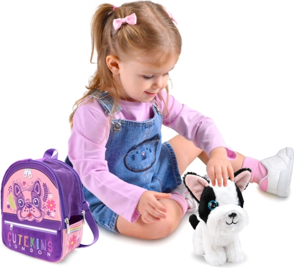 The CUTEKINS-style backpack offers a zipped front pocket for small items, a mesh side pocket for a bottle, and comfortable straps. It is lightweight, durable, and designed to make it easy for kids to carry their favorite treasures—and the puppy itself.