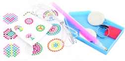 The set includes 8 colors of gems, a base for a pendant and a ring, a cord, 9 pendant templates, 4 ring templates, a tray, and an application pen—just open and create.