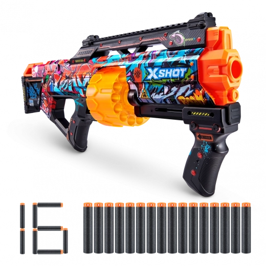 Experience adrenaline-fueled action with the X-Shot Skins Last Stand blaster, featuring a large rotating drum, a modern graffiti design, and a range of up to 27 meters. The pack includes 16 foam darts for long, safe fun in the yard or on the playground.