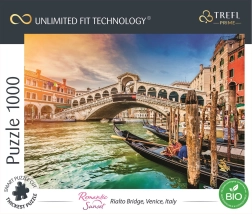 Discover limitless fun with the TREFL UFT Romantic Sunset – Rialto Bridge in Venice, 1000-piece puzzle. Thanks to Unlimited Fit Technology, you can connect multiple designs into one collage, where you define the size and shape. The puzzle stands out for its top-quality cardboard, unique piece shapes, strong cohesion, and eco packaging without plastic wrap.