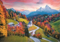 Immerse yourself in the picturesque atmosphere of the Alpine foothills. This motif with a winding road, a small church, and colorful autumn foliage against snow-capped mountains will please both eyes and mind. Thanks to Unlimited Fit Technology (UFT), individual images from the same series can be precisely connected to create large, original collages without limits.