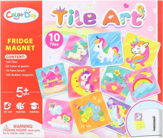 Discover a fun kit for kids to make fridge magnets. The set includes 10 porcelain tiles, 10 magnets, 6 paints, and a brush—everything children aged 5+ need to create their own original decorations.