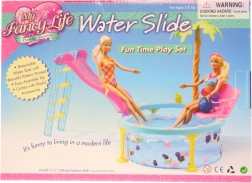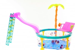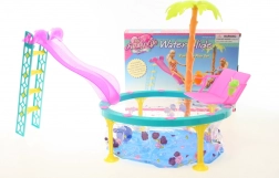 Glorie pool with slide is the ideal toy for little children who love playing with dolls. This set includes everything needed for fun swimming and sliding.
