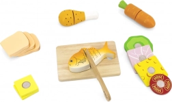 Introducing the wooden food set, perfect for little chefs. This set includes all the favorite foods for cutting, including fish, chicken, toast bread, and more. Each piece is carefully designed to look like real food and is made of safe wood with a natural finish and painted details.