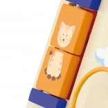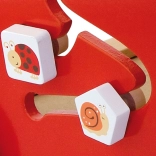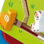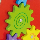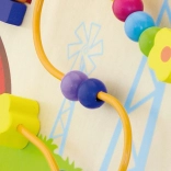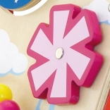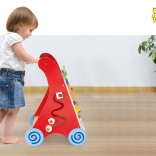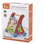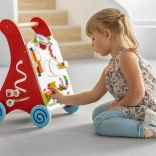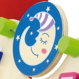 This high-quality wooden walker with an activity center combines walking support with rich sensory stimulation. The front panel offers rotating elements with the sun and moon, a spinning pinwheel, a five-bead motor loop, a rotating disc with a kitten, and sliding animals (cow, dog, horse) along a track into the barn. The sides are complemented by gears and a track with a bee, ladybird, and snail.