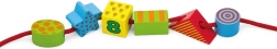 This wooden lacing set offers children endless crafting possibilities: threading like beads, building towers and little houses, or sorting by colors and shapes. Large pieces (approx. 4 cm) are easy to hold and ideal for first motor-skill exercises.