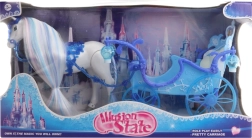 Little horse with a blue carriage. After inserting batteries, the horse walks, plays music, and the carriage lanterns light up. Powered by 2 AA batteries (not included). Package dimensions approx. 56 x 30 x 19 cm. Age 3+