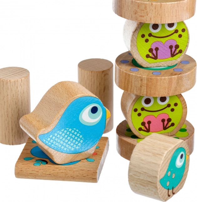 Discover a fun wooden balancing game for kids featuring frogs, birds, and butterflies. The set includes 33 pieces and double-sided pattern cards that develop fine motor skills, hand–eye coordination, patience, and creativity. High-quality wooden blocks with rounded edges are safe for little hands and can be stored in a practical linen drawstring bag for travel.