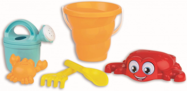 Introducing a 6-piece sand set that will enliven any beach or sandbox play. It includes a bucket shaped like a shell, a sieve with a cheerful crab motif, a mold in the shape of a crab, a practical watering can, a shovel, and rakes, ensuring hours of creative fun for your children.