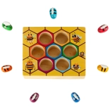 Educational Game Honeycomb Montessori supports the development of motor skills and children's independence. It includes a solid wood base and seven colorful bees that children place into the corresponding holes using the provided red plastic tweezers.