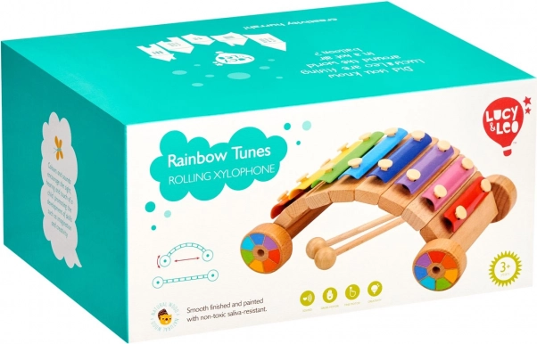 The LUCY & LEO rainbow xylophone combines a musical instrument with a pull-along toy. Rainbow-colored metal bars invite first melodies, while the sturdy wooden base with wheels supports active play. Children naturally learn to distinguish tones, feel rhythm, and develop hand–eye coordination.