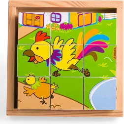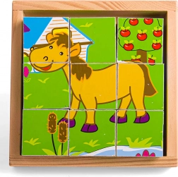 Nine sturdy wooden blocks combine to form six adorable animal pictures. Children can rotate, mix, and create with the blocks, naturally supporting fine motor skills, dexterity, and concentration. The set includes a wooden base for easy building and safe storage—ideal at home and on the go.
