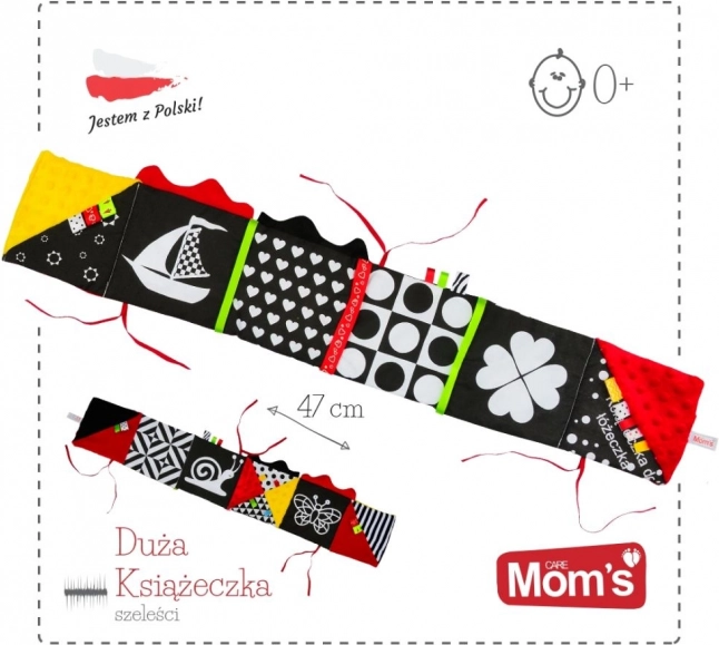 This sensory book for babies supports natural development from birth. High-contrast motifs help develop vision, soft materials and different surfaces (terry, minky) stimulate touch, and crinkly sections encourage hearing. The book can be unfolded along the crib to create a safe and stimulating environment.