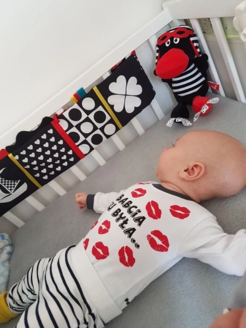 Discover gentle, enriching play for the very youngest. This sensory crib book combines high-contrast colors (black, white, red), varied textures, and crinkly elements to stimulate sight, touch, and hearing. Thanks to the tie strings, you can easily attach it to a crib or stroller, where it also serves as a soft bump-protection. Made from safe materials with OEKO-TEX certification and compliant with CE standards.