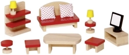 The set includes 13 carefully crafted pieces — a sofa, tables, a TV with stand, a shelving unit, shelves, a lamp, and other accessories to bring any dollhouse to life.