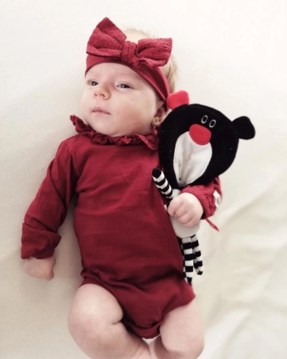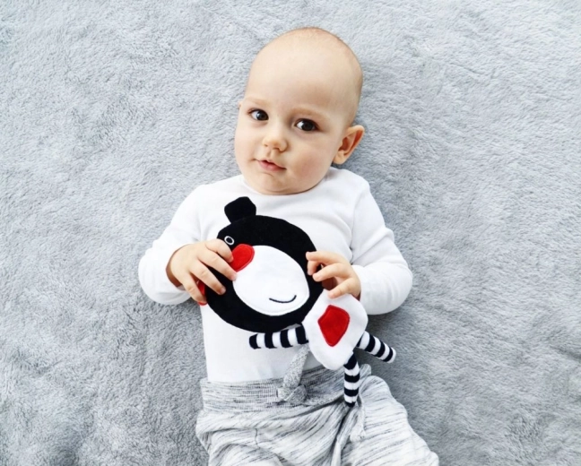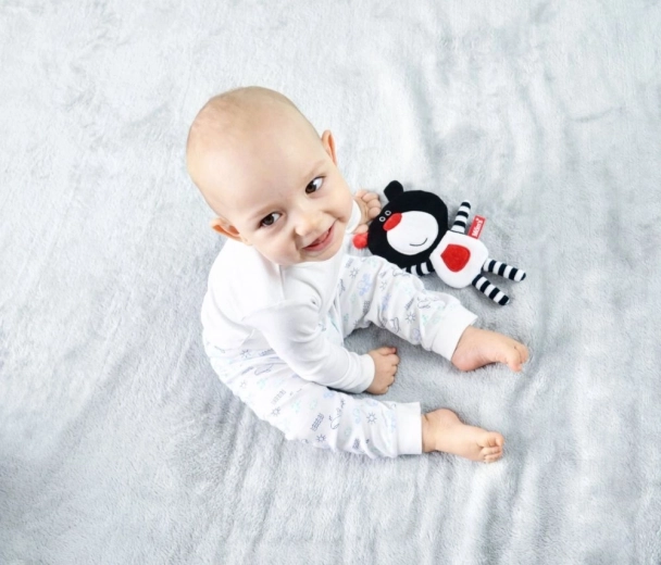 This lightweight, cuddly crinkly teddy is designed to provide babies with just-right visual, auditory, and tactile stimuli. The high contrast of black, white, and red helps focus and trains vision, while the gentle crinkle foil inside evokes familiar sounds and brings a sense of security.