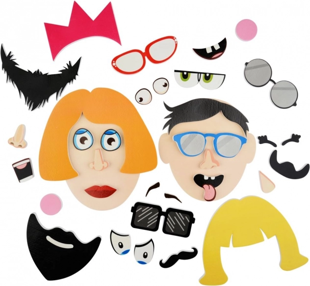 - 35 pieces — eyes, noses, mouths, hair, glasses, a crown, and more accessories