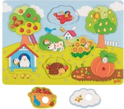 Goki Wooden Puzzle In the Garden is a colorful toy ideal for developing children's motor and cognitive skills. It has eight colored pieces with a background image that fit perfectly on their wooden base.