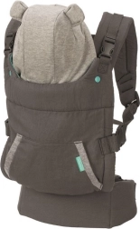 The Infantino baby carrier is ergonomically designed for comfort and safety, with adjustable shoulder straps and a padded lumbar belt for even weight distribution. It includes a removable hood with a bear motif for a fun design.