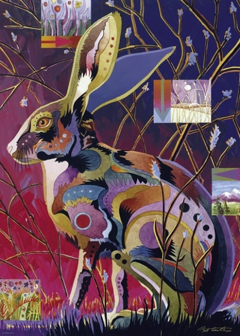 This designer puzzle showcases a striking, decorative composition by artist Bob Coonts, who lives in the Rocky Mountains and is renowned for his colorful style capturing the beauty of animals. The rabbit motif will delight nature lovers and collectors of original illustrations.