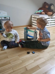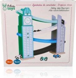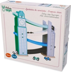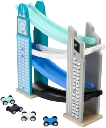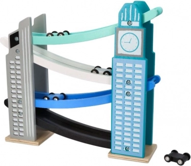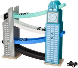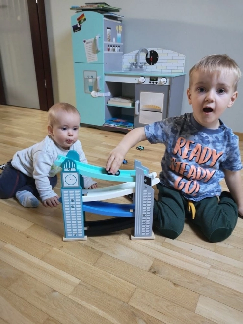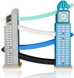Our wooden raceway is designed to resemble iconic city structures, including a clock tower. It’s made from quality wood and offers several levels with colorful ramps in blue, black, and white. Kids will love releasing the small colorful cars from the top all the way down. The track not only provides fun but also develops fine motor skills and teaches physical principles like gravity and speed.