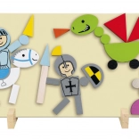A creative magnetic set with a knights theme that develops children's fine motor skills, creativity, and imagination. The package includes a magnetic board, stands, and colorful wooden pieces with magnets to assemble various medieval characters and scenes.