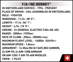 Discover the precise model of the F/A-18C Hornet in Swiss colors made from COBI building blocks. This exclusive set includes 540 pieces and allows you to create a realistic fighter with opening landing gear and a rich weapons arsenal.