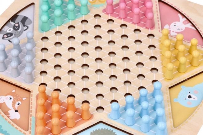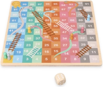 This wooden board game brings two classics in one. On one side you’ll find the strategic HALAMA (Chinese Checkers), where the goal is to move all your pieces to the opposite side. On the other side is the lively game Snakes and Ladders, where you roll the die to reach the finish, climbing ladders and sliding down snakes.