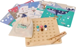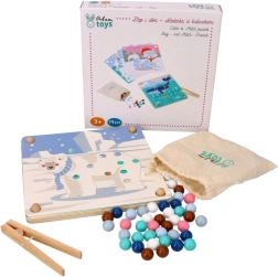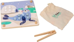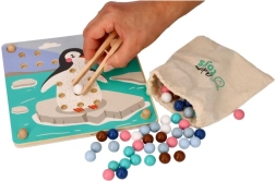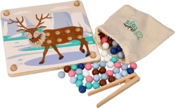 This fun educational game combines natural childhood curiosity with skills training: using the wooden tweezers, children transfer beads and place them into holes by color and according to templates featuring Arctic animals (penguin, seal, reindeer, polar bear). The game fosters concentration, a precise grip, and a steady hand – ideal for preschoolers.