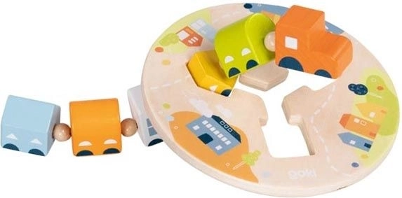 This high-quality wooden train from GOKI is designed as a clever skill-building game to support children’s development. The locomotive with five differently shaped carriages passes through a threading base and continues only when the carriages are placed in the correct position. Children naturally learn logic and hand–eye coordination.
