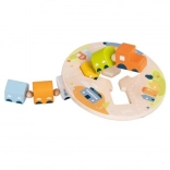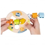 Inserting and moving the five differently shaped carriages helps children develop grip, hand–eye coordination, and patience.