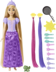 The Rapunzel doll inspired by the movie Tangled brings hours of creative fun. Her very long hair invites brushing, braiding, and decorating, while the clip-in strands change color in warm water—from purple to pink and from pink to blue. Kids can easily recreate movie hairstyles or invent their own.