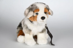 This plush Australian shepherd is perfect for children of all ages. It has a comfortable size of approximately 23 x 20 x 16 cm, which is suitable for smaller children's hands. The metal details on the leash add a realistic look, and the leash itself is 21 cm long.