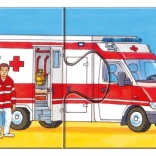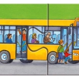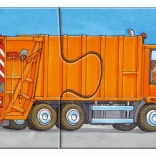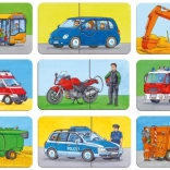This set includes 9 separate puzzles, each with 2 pieces, featuring themes such as firefighter, garbage truck, excavator, combine harvester, bus, and motorcycle. Thanks to the simple piece count, assembling is ideal for a first introduction to puzzles and supports proper skill development.