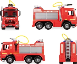 The large plastic LENA Giga Trucks fire engine, 66 cm long, brings kids realistic fun at home and outdoors. It features a working water sprayer with a 1.5 l tank, a powerful piston pump, a rotating and removable nozzle attachment, and an extendable ladder. The robust design with steel axles ensures stability and long service life. Made in Europe, TÜV certified.