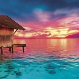 An evocative scene of a wooden hut above the water in warm colors creates a sense of harmony and helps you switch off from the everyday rush.