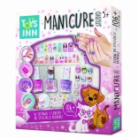 The set includes 3 nail polishes, nail tips, nail stickers, 2 files, a sheet of stickers, and a ring.