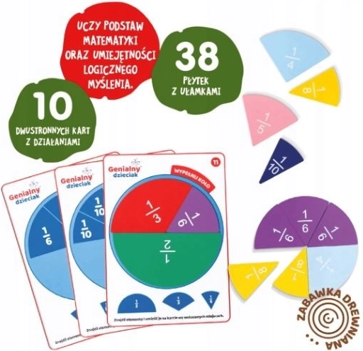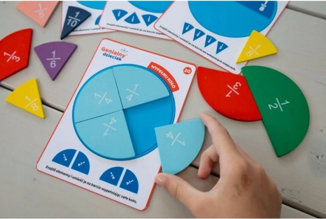 The set includes wooden pieces illustrating the fractions 1/2, 1/3, 1/4, 1/5, 1/6, 1/8, 1/10, and is complemented by matching activity cards.