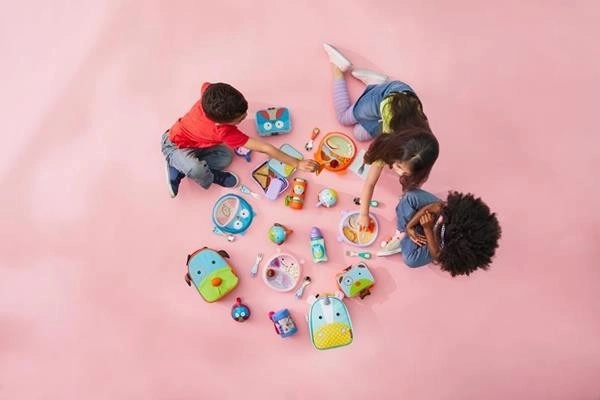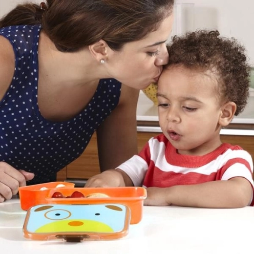 The container (including a bottle) fits inside the SKIP HOP ZOO insulated lunch bag, whose thermal interior helps keep demanding snacks at the right temperature.