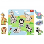 The board features black-and-white outlines matching the motifs on the pieces to make matching clear and motivating. The safe design and sturdy construction make this puzzle an ideal choice for early learning of shapes and animals from the world of Safari.