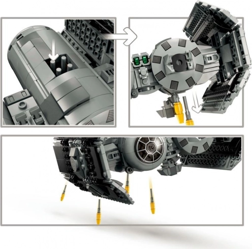Build the legendary TIE Bomber from the world of STAR WARS and embark on tense Imperial missions against the Rebels. The model features an opening cockpit, a torpedo drop function, and two shooters for action-packed play. Includes minifigures of Darth Vader, Vice Admiral Sloane, a TIE Pilot, a GNK droid, and a service cart. An ideal gift for kids aged 9+.