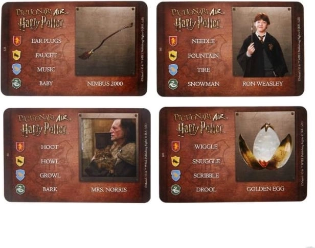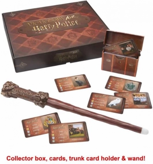 Get ready for a magical twist on the classic family drawing game with Pictionary Air Harry Potter. In this enchanting game that will delight witches, wizards, and Muggles alike, you draw in the air and see it on the screen! Each team chooses which Hogwarts house to play for (Gryffindor, Hufflepuff, Slytherin, or Ravenclaw). Open the collectible box to discover a Pictionary Air pen shaped like Harry Potter’s famous wand, a card case inspired by Harry’s trunk, and 112 double-sided cards with clues inspired by the Wizarding World. Download the free Pictionary Air app to your smartphone or tablet and start playing (data charges may apply). The game requires a compatible iOS or Android mobile device and the app. Point the in-app camera at the illustrator, and they’ll appear with their sketch on your smart device’s screen. For an even more magical experience, players can stream their drawings from a smart device to a TV using Apple TV, Chromecast, or a similar streaming device. A compatible streaming device is required to stream gameplay to a TV. Compatible devices may change. For the latest compatible device information and more details, visit the Pictionary Air support page (www.pictionary.com/support). This family game offers fantastic fun for any game night or party. Colors and decorations may vary.