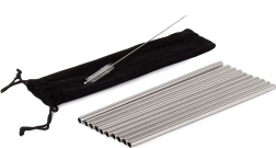 The set includes 10 straight straws, a long cleaning brush for easy maintenance, and a soft black pouch with a drawstring. Simply wash the straws with water and dish soap; the brush reaches even hard-to-access areas. Ideal for home, work, travel, and camping.