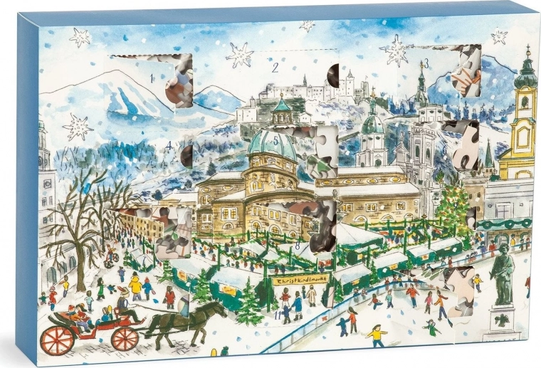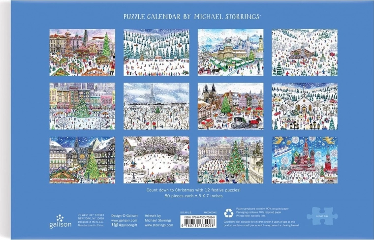 Open 12 numbered windows and assemble a new winter scene every day. Each puzzle has 80 pieces and the same dimensions for comfortable daily puzzling.