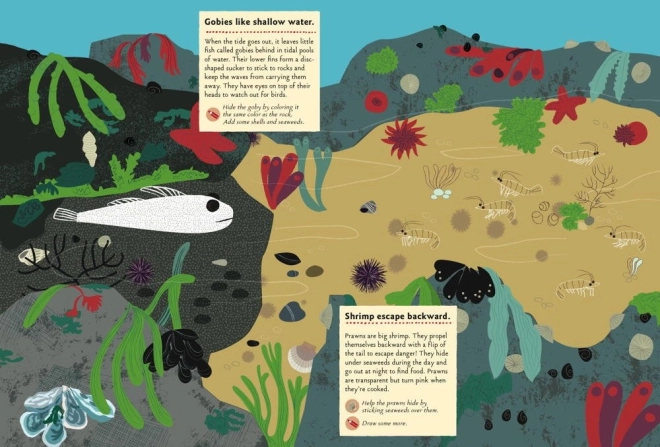 - 24 activities including coloring jellyfish and anemones, completing a crab’s body, and drawing shells, reeds, and starfish