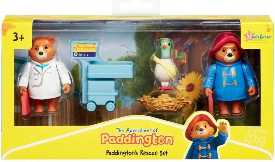 Discover the magical PADDINGTON Rescue Set, bringing creative and imaginative play for children aged 3 and up. The box includes a Paddington Bear figure in a blue coat, his bird friend, medical accessories, and a wheeled examination cart. The figures have movable arms and are compatible with other The Adventures of PADDINGTON sets.