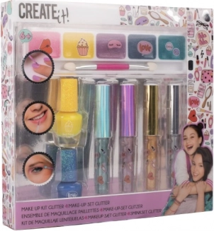 This colorful CREATE IT! makeup set brings everything kids need for a first, safe introduction to cosmetics. Metallic shades and glitter effects create an original look for any kids’ party or afternoon play.